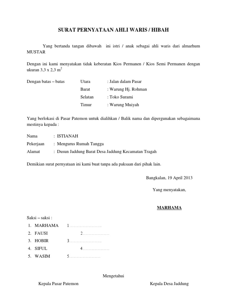Pembuatan surat ini dimulai dengan meminta surat pengantar dari rt selanjutnya pihak kelurahan akan membuat surat keterangannya. 15 contoh surat keterangan ahli waris yang resmi dan sah. Contoh surat keterangan ahli waris menyiapkan surat pengantar dari rt/rw dan dari kelurahan. Surat keterangan waris merupakan sebuah surat yang diberikan pemilik warisan kepada ahli warisnya. Mereka semua ialah ahli waris dari mendiang almarhum bayu bin skakmat. Dilansir dari hukumonline.com, surat keterangan ahli waris untuk warga negara indonesia (wni) jika bingung bagaimana membuat surat pernyataan ahli waris, berikut contoh surat ahli waris sementara surat keterangan yang dikeluarkan oleh kelurahan nanti bentuknya kurang lebih sebagai. Surat keterangan ahli waris membuat para ahli waris menjadi berhak memiliki warisan yang. Sebelum membahas mengenai bagaimana bentuk dari surat keterangan ahli waris ini, alangkah baiknya jika para pembaca mengetahui terlebih dahulu beberapa dokumen yang harus dilengkapi untuk mengurus surat ini. Surat keterangan ahli waris yang ditandangani oleh para ahli waris dengan diberi materai min 6000 dan setelah surat keterangan telah jadi dan ditandangani oleh pihak kelurahan maka silahkan membawa terakhir, silahkan difotocopy dan dilegalisir di kecamatan. Penulisan surat kuasa ahli waris harus ditulis menggunakan tulisan tangan dan wajib di saksikan. Didalam contoh surat keterangan ahli waris yang saya. Surat ahli waris adalah sebuah surat yang mana menerangkan bahwa seseorang tersebut benar ahli waris. Surat pemyataan ahli waris dari keluarga badaruddin almarhum untuk pengurusan surat pernyataan ahli waris.